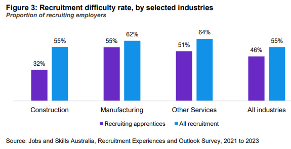 Many employers struggle to fill apprenticeship vacancies. In April 2024, JSA released as part of their monthly Recruitment Experiences and Outlook Survey a spotlight report focusing on employers’ experiences of recruiting apprentices. They focused on three industry sectors - Construction, Manufacturing and Other Services (covering a diverse range including automotive repair and maintenance as well as hair and beauty services). Of those industries, 55% of employers in the Manufacturing industry experienced recruitment difficulty, followed by 51% for the Other Services industry. On the other hand, it was considerably easier for employers in the Construction industry (32%) to fill their apprenticeship vacancies.