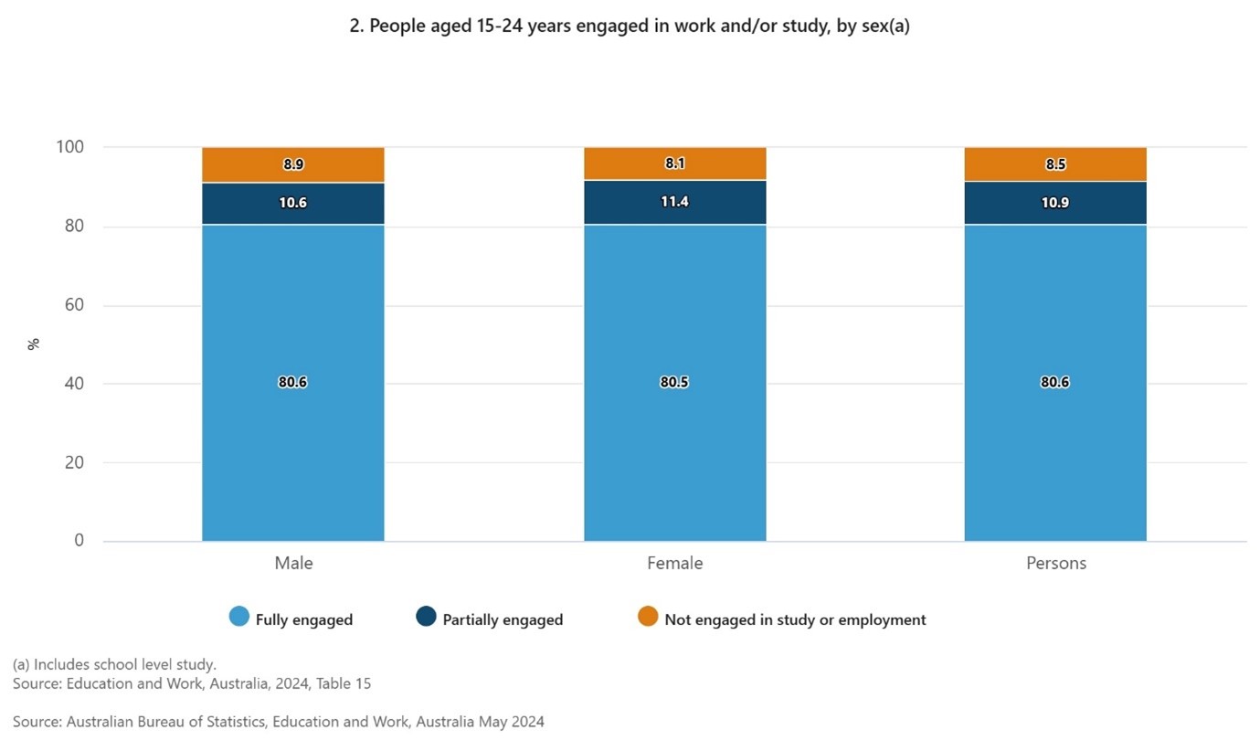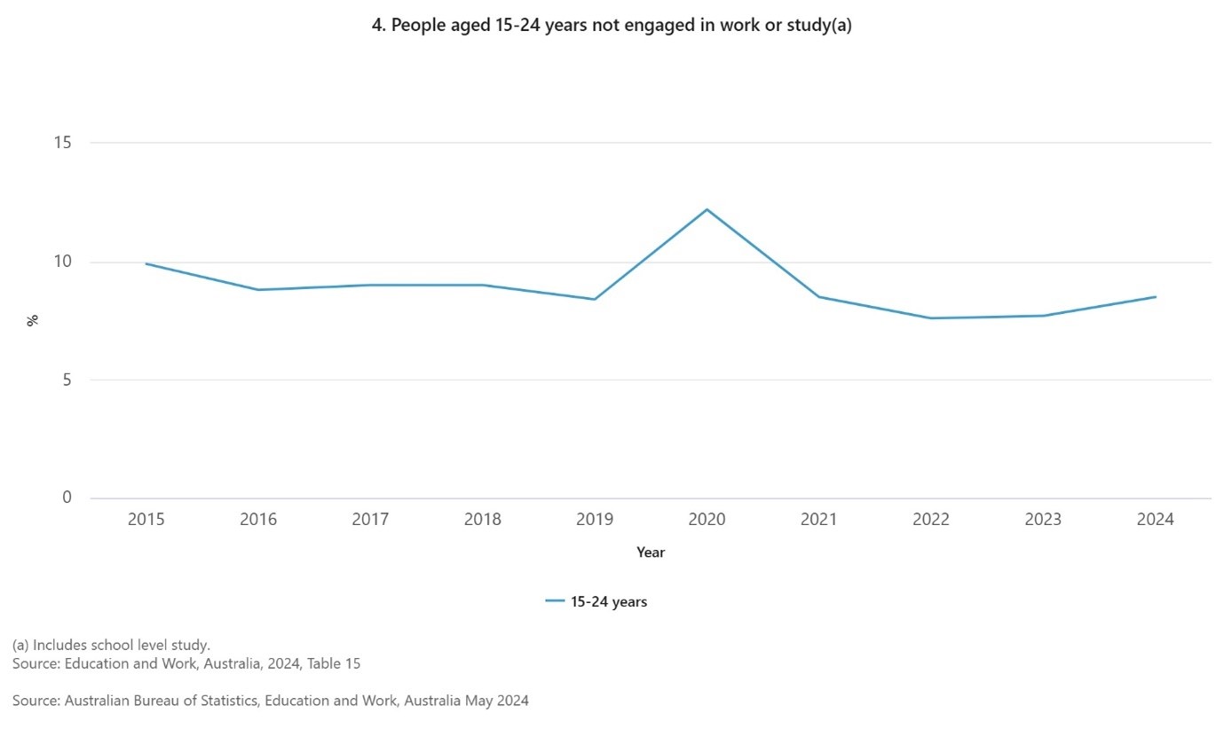 Importantly, for employers and policy-makers, is to ensure that young people completing and moving out of high school are either earning or learning to avoid the situation where they are completely disengaged from work and studies. The ABS reports that in 2024, around 8.5% of people aged 15-24 years were not engaged in study or employment.